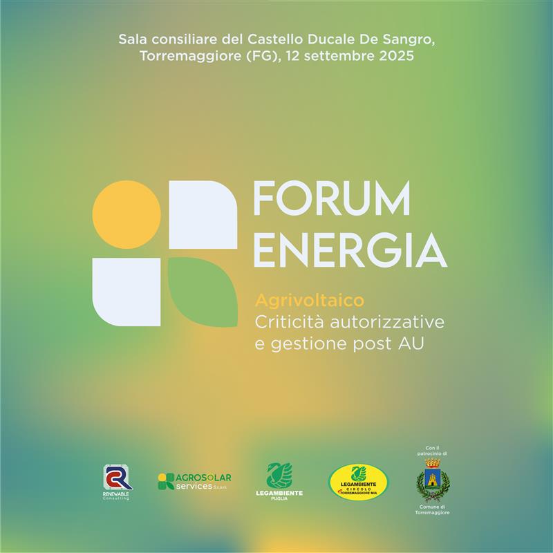 Il 12/09/2025 ritorna a Torremaggiore (FG) il Forum Energia, promosso da Renewable Consulting e Legambiente Puglia, con la sua seconda edizione incentrata sull’agrivoltaico.
